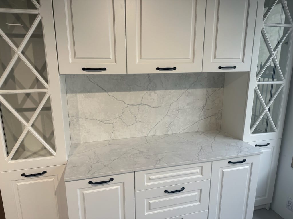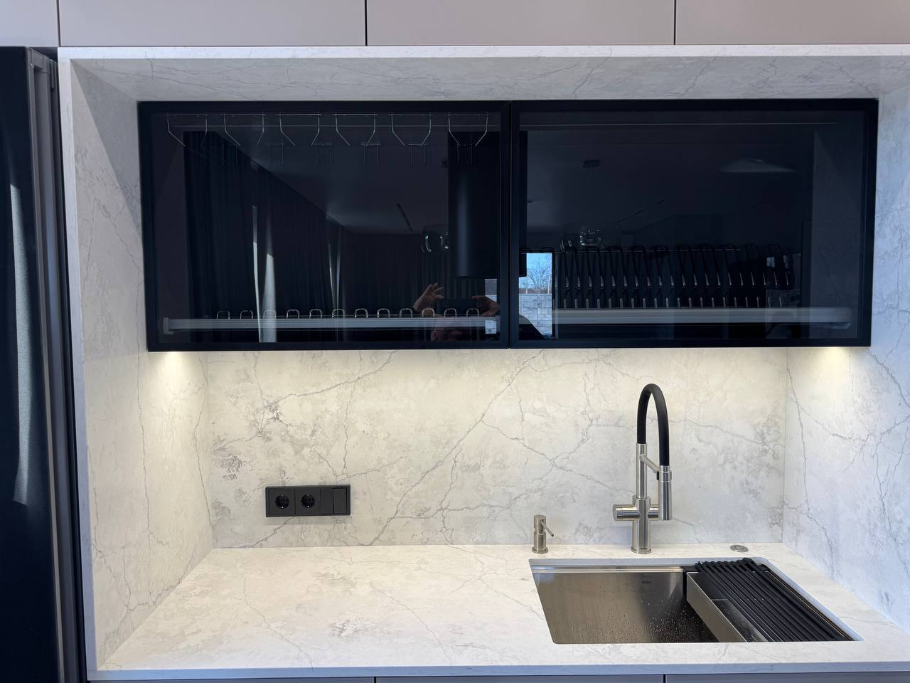 Tarkempi tarkastelu paljastaa hienovaraisia siniharmaita pohjasävyjä ja monimuotoisia haaroittumia, jotka tuovat kuvioon syvyyttä ja aitouden tuntua. Kiillotettu pinta korostaa tämän dynaamisen kuvion selkeyttä, tehden Calacatta Concordesta todellisen katseenvangitsijan missä tahansa laadukkaassa ja modernissa keittiössä.