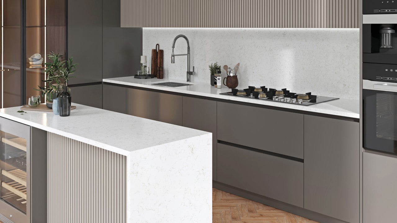 Azur Creme on kvartsitaso, joka vangitsee klassisen marmorin ajattoman kauneuden. Sen pehmeää, kermanvalkoista taustaa koristaa herkkä, lämpimän beigen sävyisten juovien verkosto, joka kiemurtelee pinnan halki luoden tunteen lempeästä ja luonnollisesta liikkeestä.
