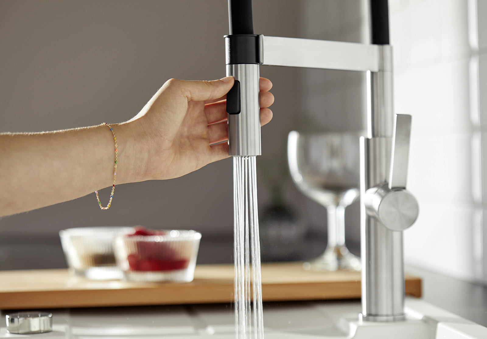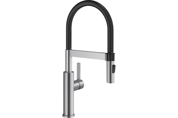 Blanco Sonea-S Flexo on ammattimaista tyyliä edustava keittiöhana, jossa yhdistyvät harjattu ruostumaton teräs ja joustava musta letku. Kaksitoimisella suihkupäällä voit vaihtaa helposti normaalin virtauksen ja tehosuihkun välillä, mikä tekee ruoanlaitosta ja siivouksesta vaivatonta. Magneettikiinnitys varmistaa, että letku palautuu tarkasti ja pysyy tukevasti paikallaan käytön jälkeen.
