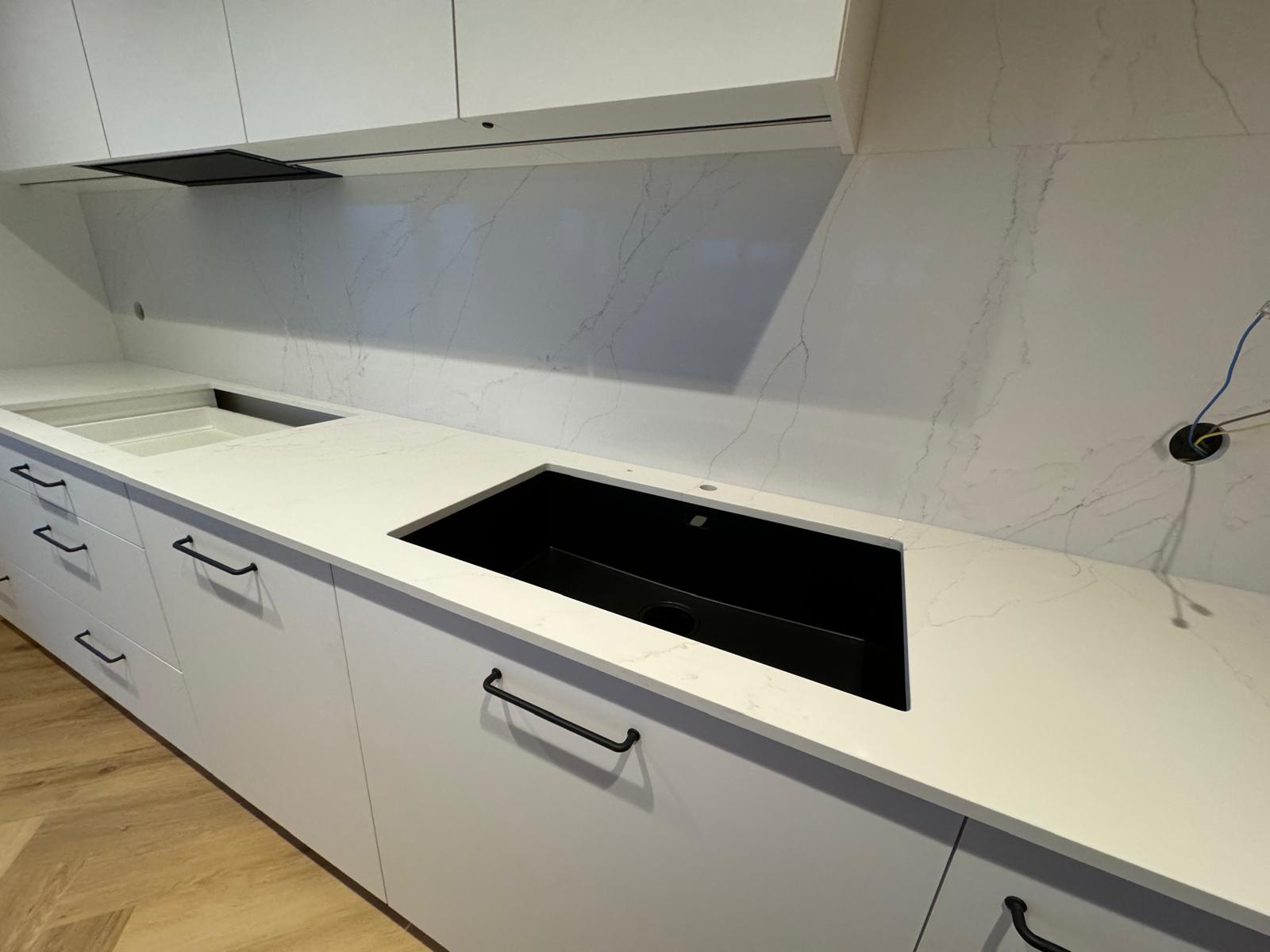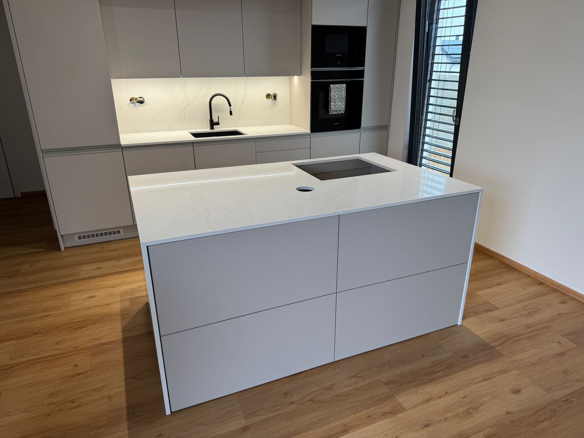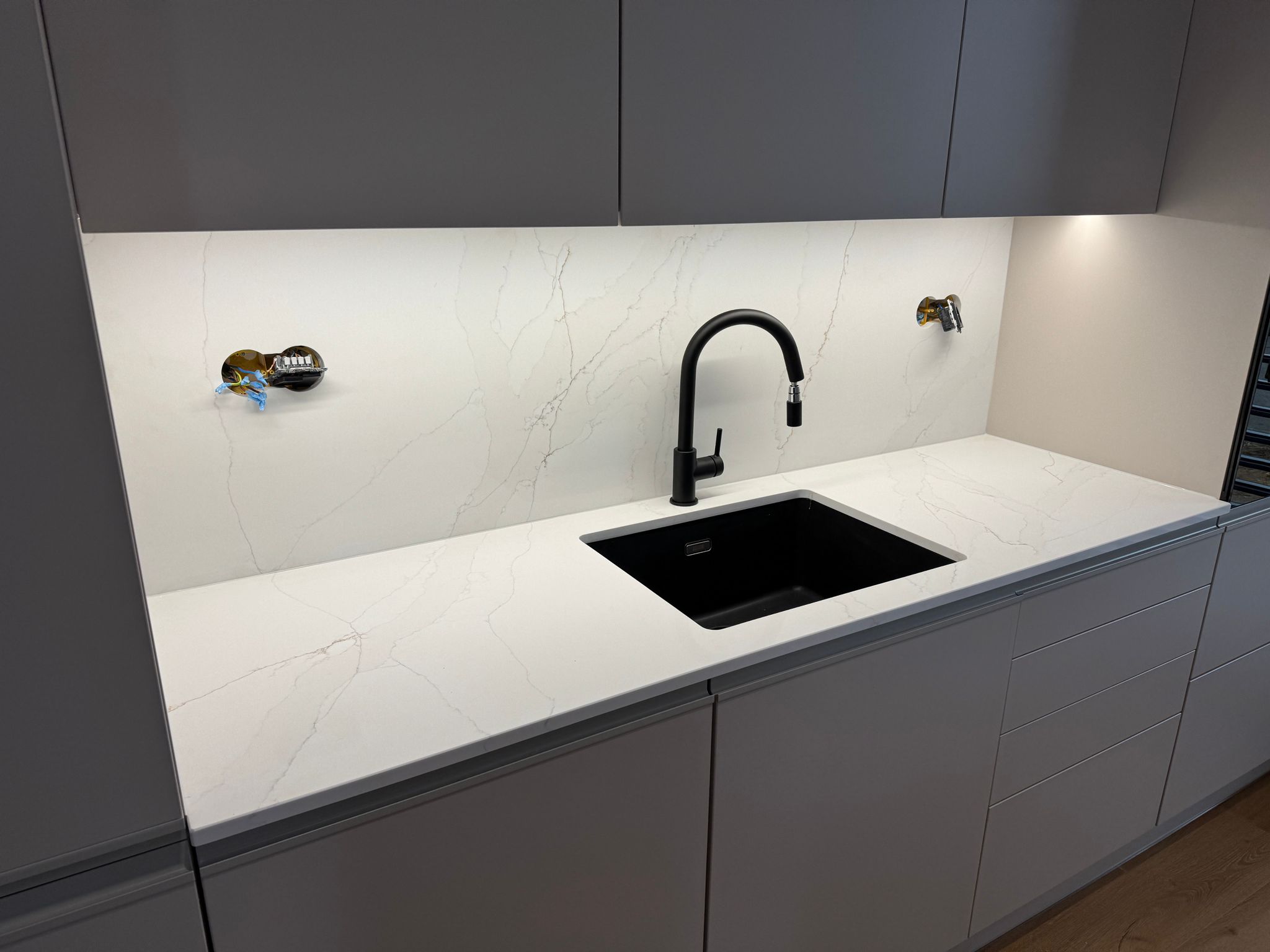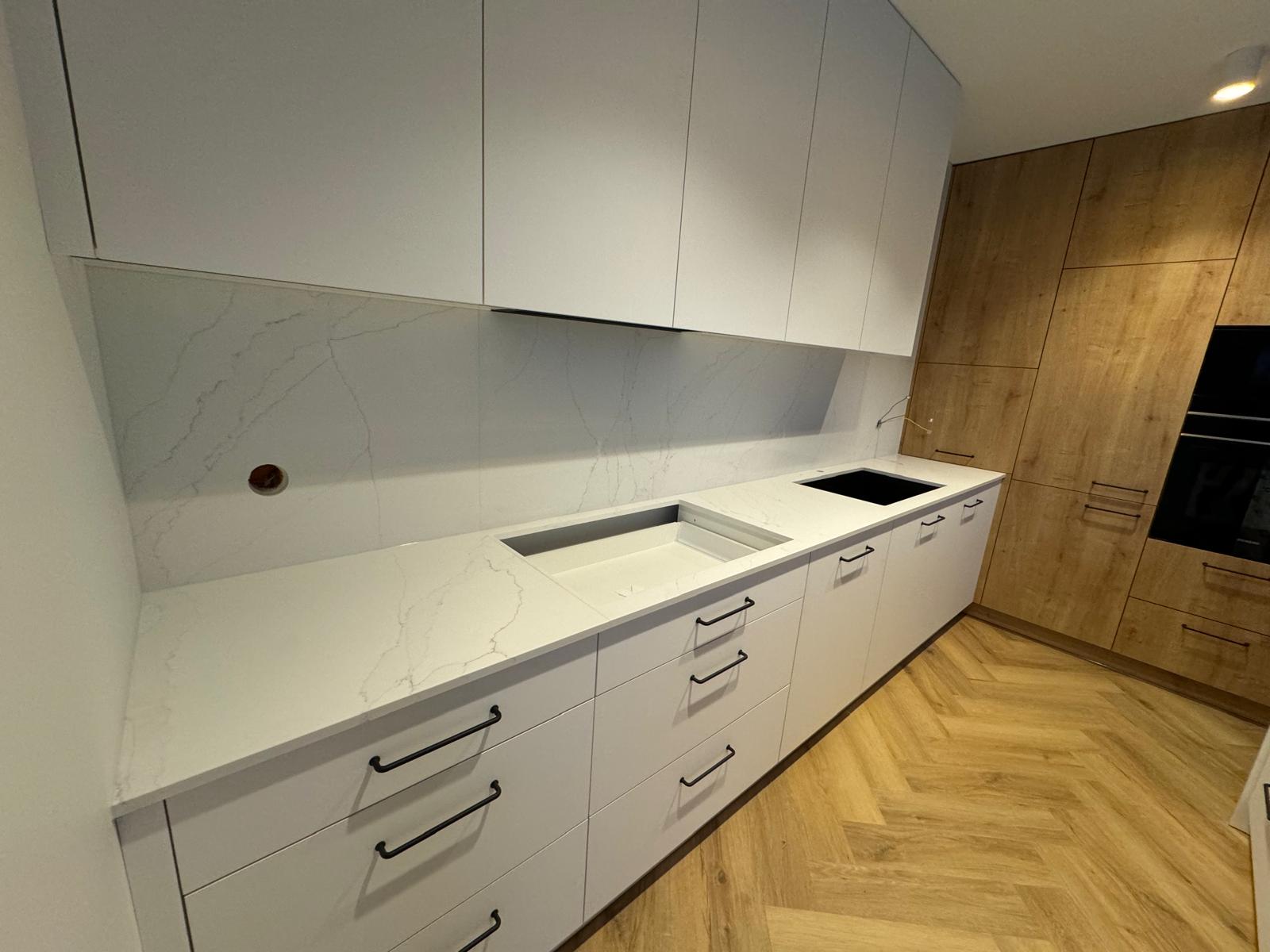 Näitä lämpimiä sävyjä täydentävät taustalla risteilevät ohuemmat, viileämmät harmaat pohjasävyt, jotka tuovat kuvioon hienostunutta syvyyttä ja tasapainoa. Tämä kvartsitaso on ylellisyyden ilmentymä ja sopii täydellisesti luomaan kutsuvan ja korkeatasoisen keskipisteen mihin tahansa huoneeseen. Se yhdistyy kauniisti sekä moderneihin että klassisiin elementteihin.